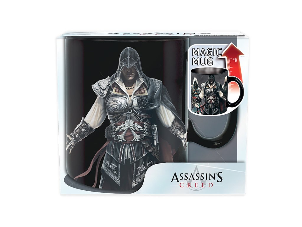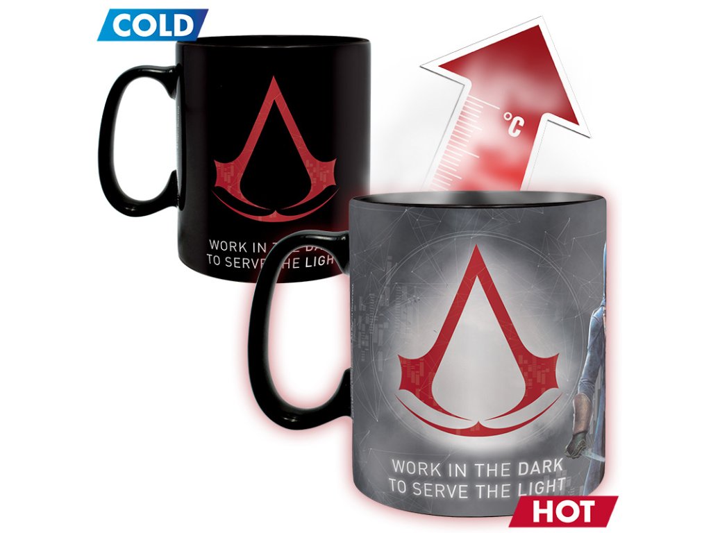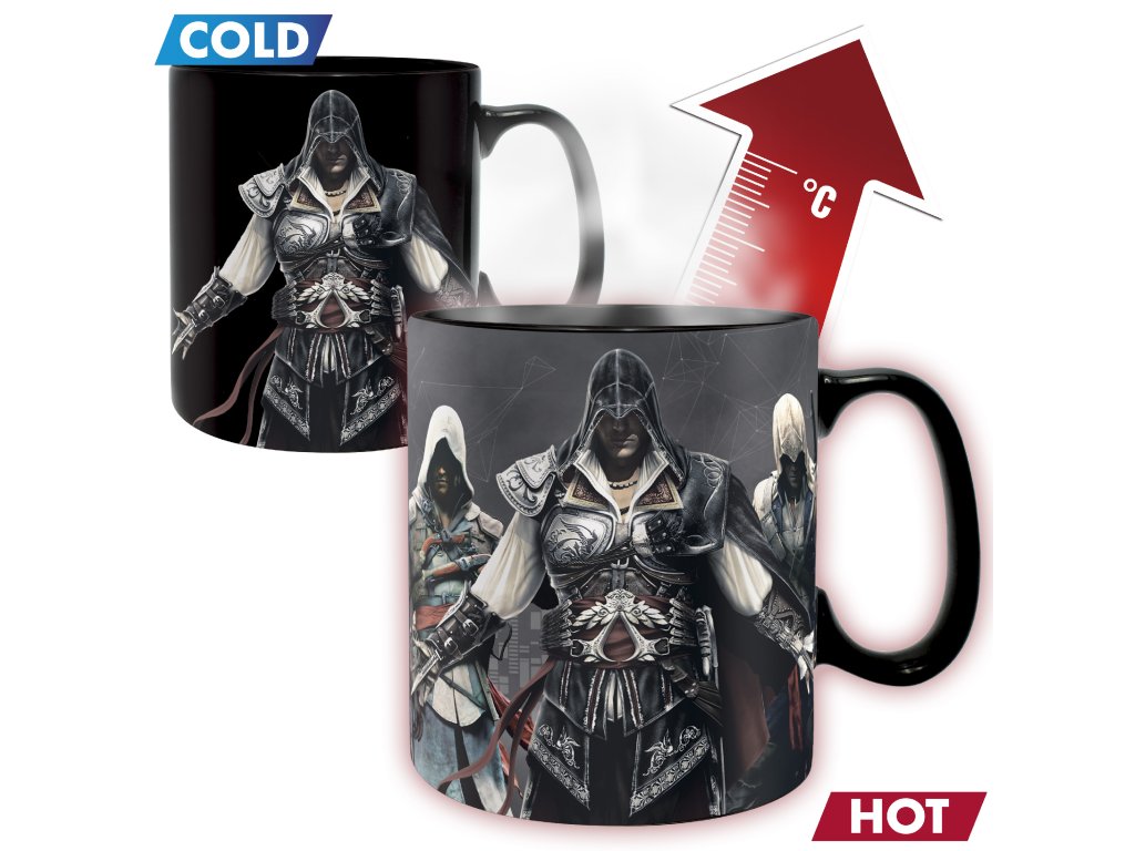 Assassins Creed hrnek - Connor, Arno a Edward vyjdou ze tmy poté, co nalijete horký nápoj do hrnku. Dejte si při hraní dobrou kávu nebo čaj a koukejte, jak se vám objeví celé bratrstvo.
